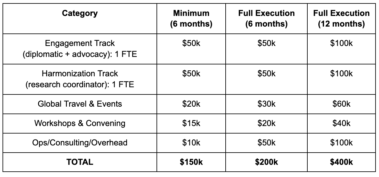 We are requesting $150k for the immediate Q1-Q2 2026 diplomatic sprint. Full 12-month execution requires ~$400k.