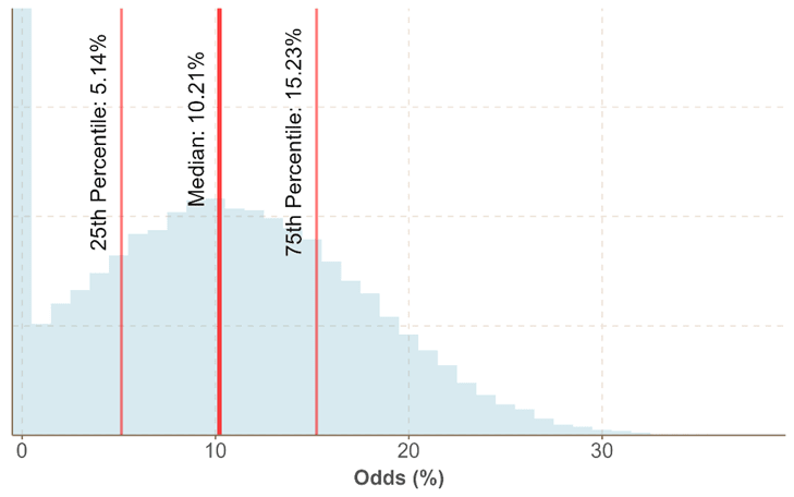 A range of overall estimates were formed by randomly sampling an odd and weight for each scenario over a uniform distribution of 0.5-2x the baseline odd and weight, bound by 0%-100% and 0-1 respectively. For instance, the 1st scenario’s odds below would be uniformly sampled between 37.5-100%, with weights 0.3-1.0. 100,000 samples were drawn to create a distribution of Pr(AGI2043).